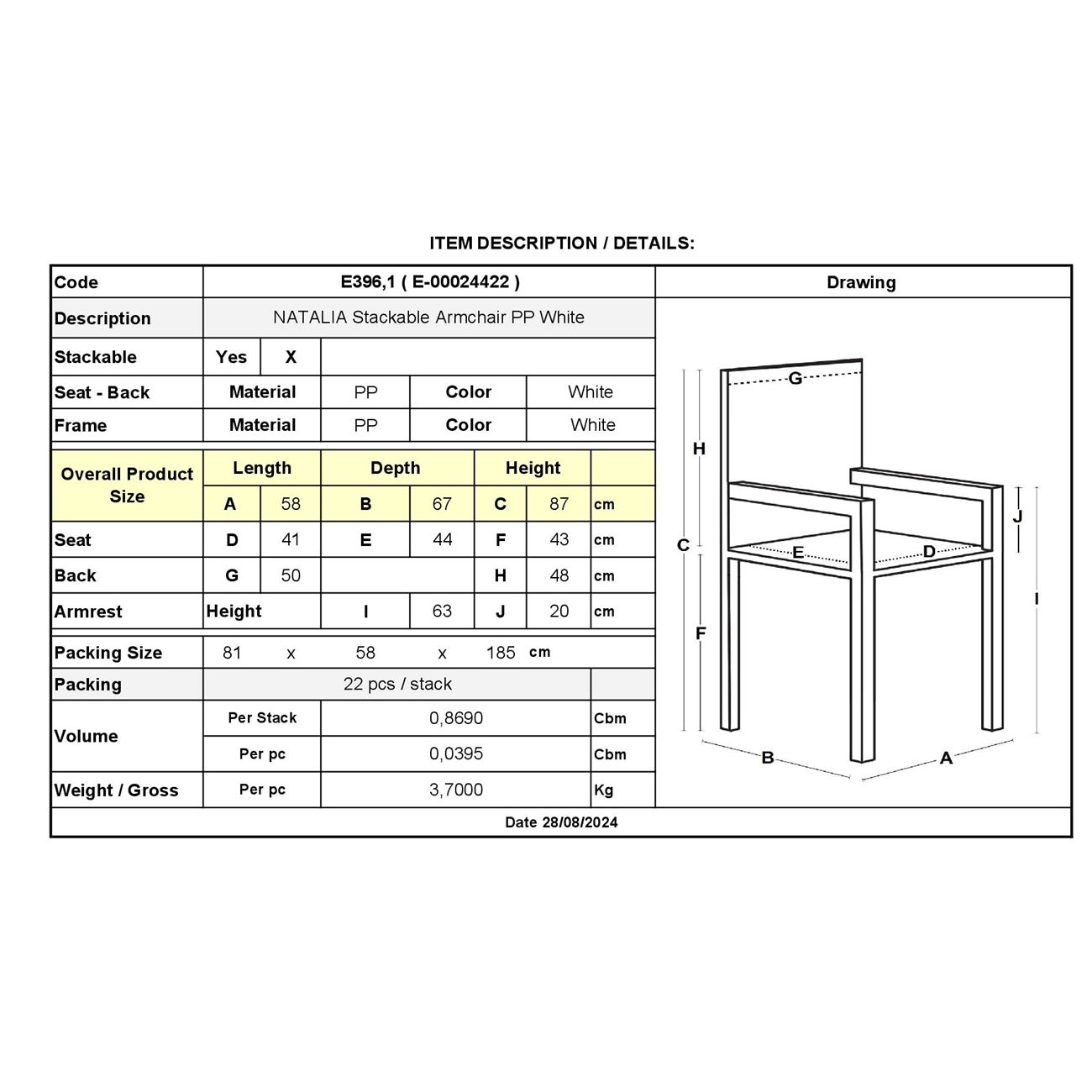 Ε396,1 NATALIA Πολυθρόνα PP Άσπρο, Στοιβαζόμενη