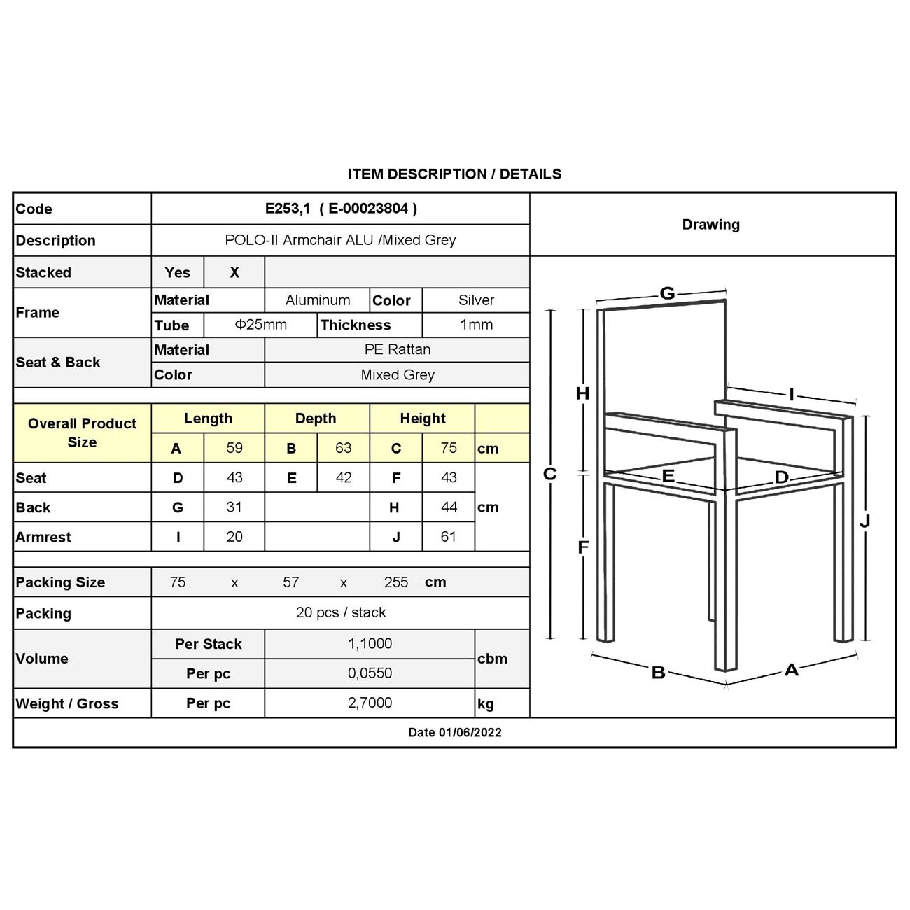 POLO-II Πολυθρόνα Βεράντας – Κήπου Αλουμινίου Στοιβαζόμενη, PE Mixed Grey (Tube:25x1mm)