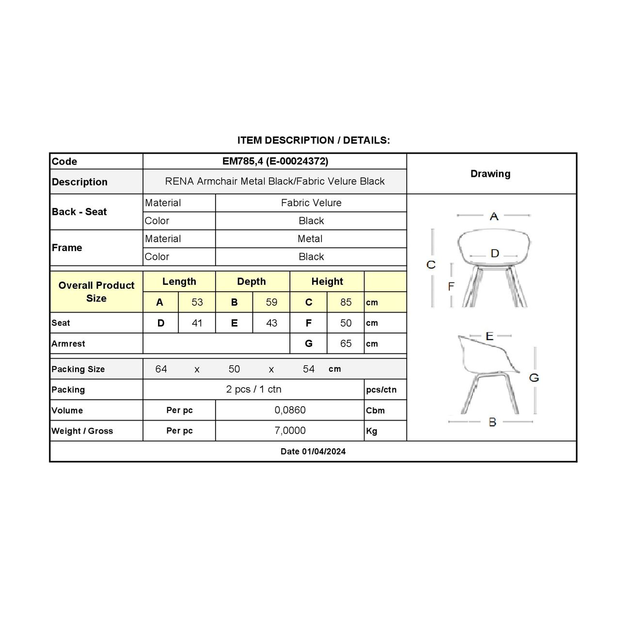 ΕΜ785,4 RENA Πολυθρόνα Μεταλ.Μαύρο/Ύφασμα Velure Μαύρο