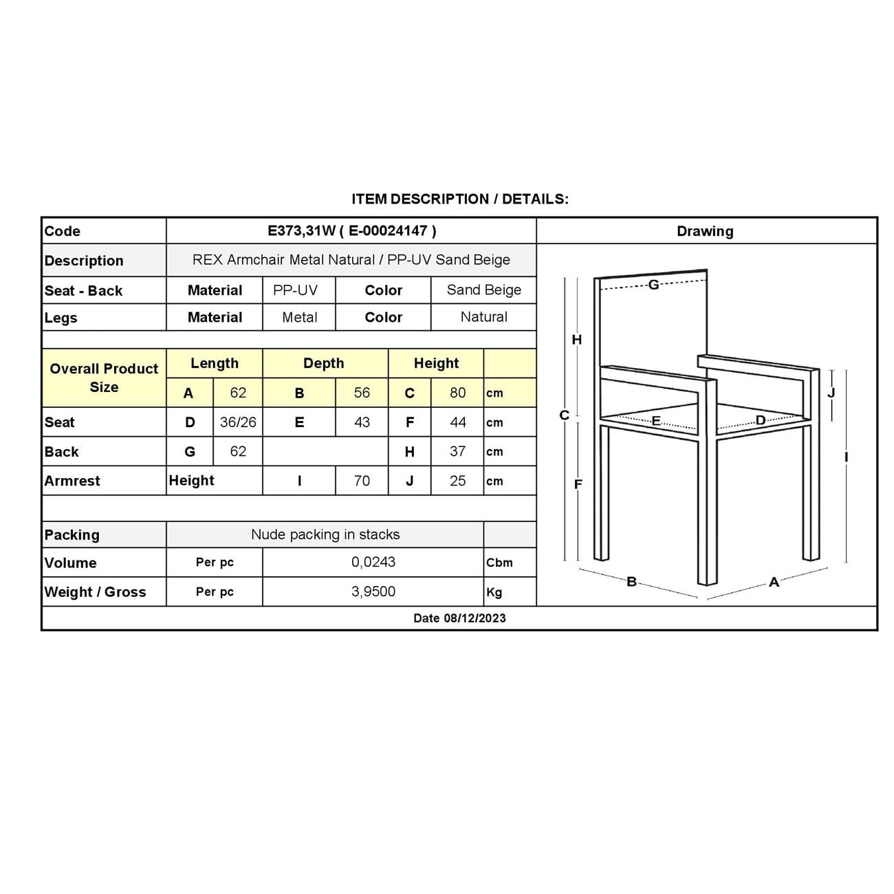 Ε373,31W REX Πολυθρόνα-Pro Μέταλλο Φυσικό/PP-UV Sand Beige