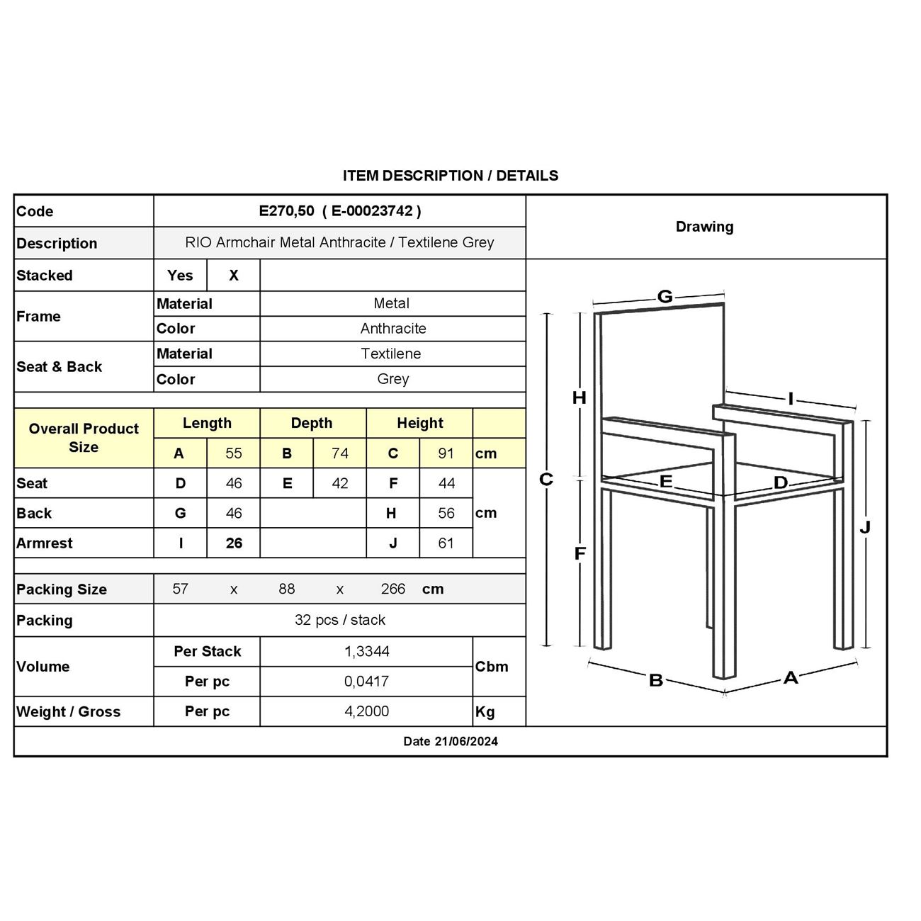 RIO Πολυθρόνα Στοιβαζόμενη Κήπου, Μέταλλο Βαφή Ανθρακί, Textilene Γκρι (4,20kg)