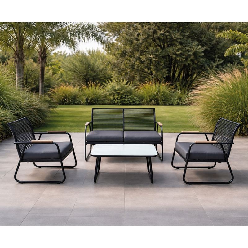 ROCCO Set Σαλόνι Κήπου 4τεμ, Μέταλλο Μαύρο,RopeWicker Γκρι, Μαξιλ.Σκούρο Γκρι, Γυαλί Μαύρο